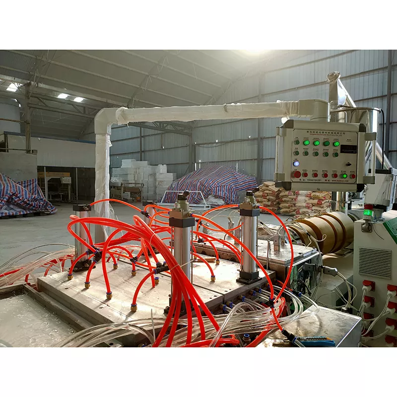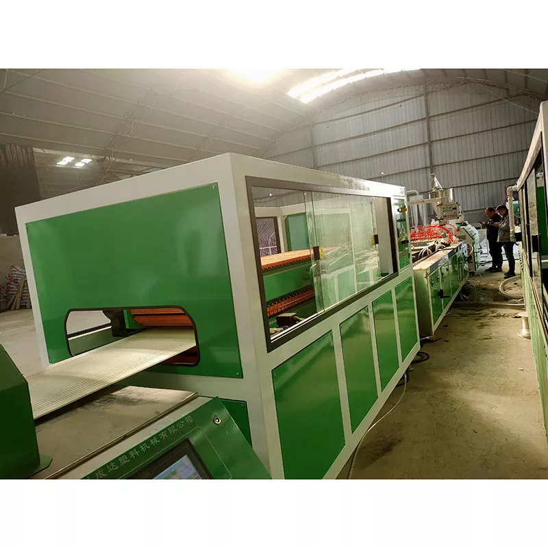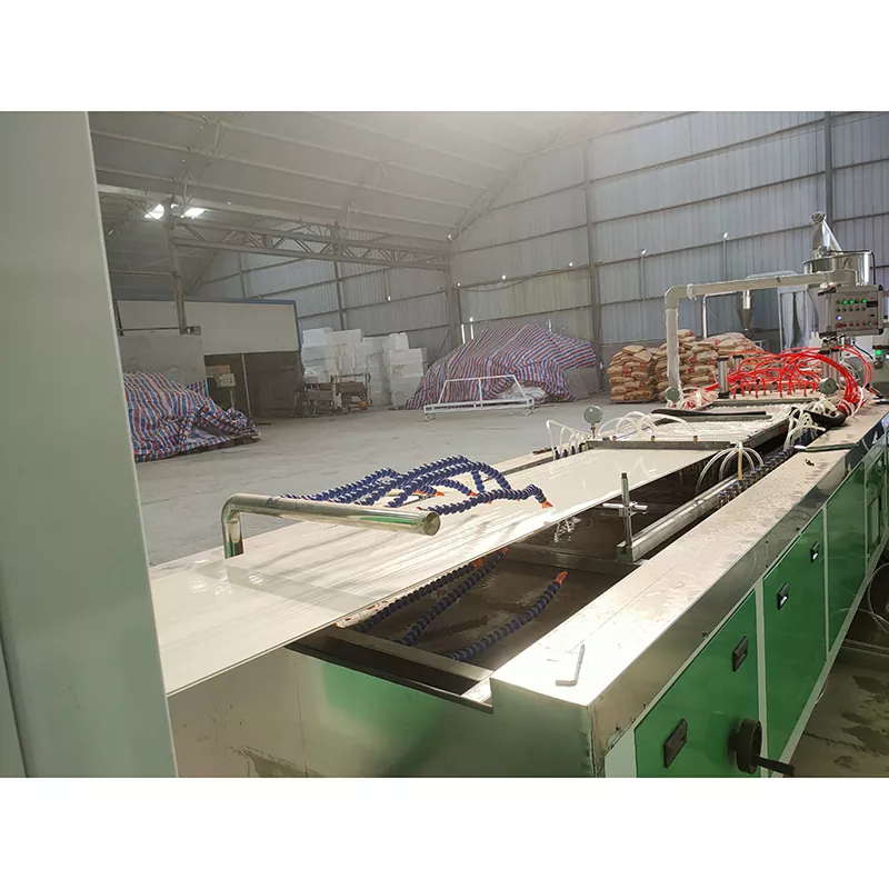 Brusilni stroj, mešalnik, drobilnik, stožčasti dvovijačni ekstruder, kalup za stenske plošče, platforma za vakuumsko oblikovanje stenskih plošč, vlečni stroj z dvojnim gosenikom, samodejni rezalni stroj brez prahu, kodirnik za samodejno razkladanje, celotna linija deluje stabilno, delovanje je preprosto in stopnja napak je nizka.